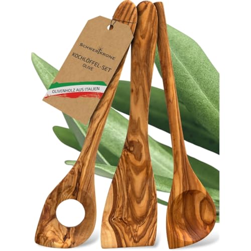 Svärdkrona olivolträ koksked set – olivträ från Italien – antibakteriell och värmebeständig – matlagningssked trä – stekspade och matlagningsskeds-set – trä kökssked