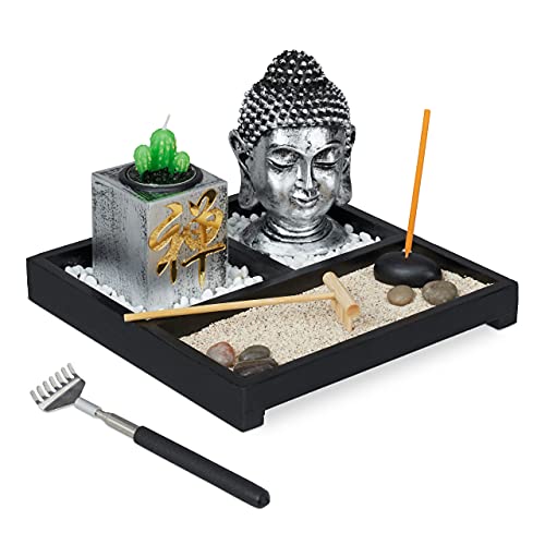 Relaxdays Zen trädgård, med Buddha, stenar, sand, rökelsepinnar och värmeljushållare, träkratta, Feng Shui-dekoration, svart, 1 styck