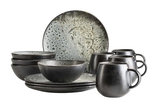 Karaca Skalt stengods, bordsservis för 4 personer, 12-delad servis med reaktiv emaljerad stengods, sallad/fling- och soppskålar, modern middagsservis för 4 personer