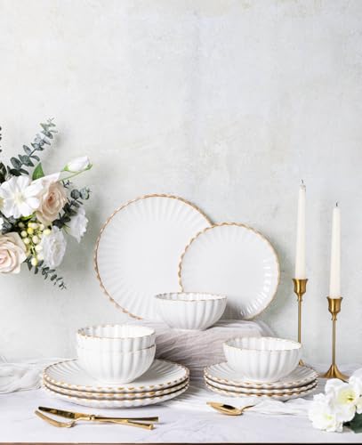 MALACASA 12-delad middagsservis för 4, tallrikar och skålar set, 12 stycken, präglade stengods servis, keramiska middagsset, mikrovågsugnssäker, Series Lydia