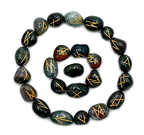 Bloodstone runor stenset med sammetspåse och instruktions-e-bok ~ äldre Futhark-runor graverade hedniska vikingasymboler för Reiki-helande, kristallnät och energibalansering