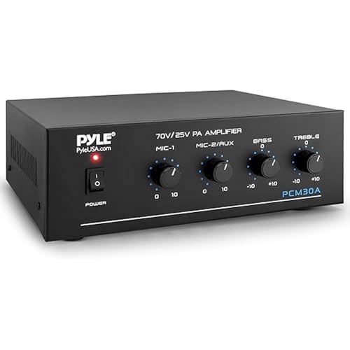 Compact Mini Home Power Amplifier - 60W Smart Small Indoor Audio Stereo Receiver w/RCA, 2 Microphone IN, 25/70 Volt Outputs, LED, Input Selector, For PA, Amplified Speaker Sound System