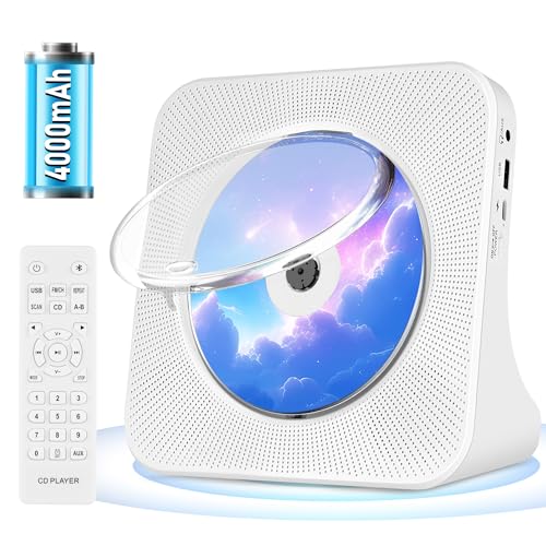 Uppladdningsbar bärbar CD-spelare, Bluetooth CD-spelare med högtalare, USB, AUX, Stereo Hifi CD spelares Radio, trådlös vit med fjärrkontroll