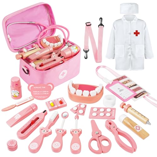Sundaymot Doktorväska för barn, leksaksset, tandläkare, trä, med äkta stetoskop, termometer, tandläkarväska, doktorleksak, present för flickor och pojkar 3, 4, 5 år (32 delar)