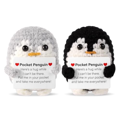 2st Pocket Penguin Kram, 6,5cm Mini Rolig Positiv Penguin Söt Virkad Docka Prydnad Stickad Penguin Toy med Positivt Kort för Dekoration Vänner Familj Födelsedagsfest Present (Grå, Svart)