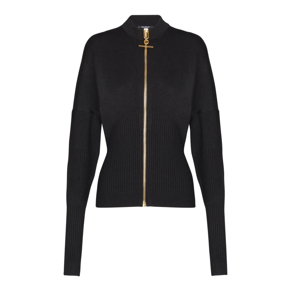 Balmain, Stickade Tröjor , Dam, S, Polyester, Stickad cardigan med dragkedja