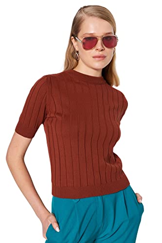 Trendyol Dam slim fit basic stickad tröja med stående krage, brun, M, Brun, M