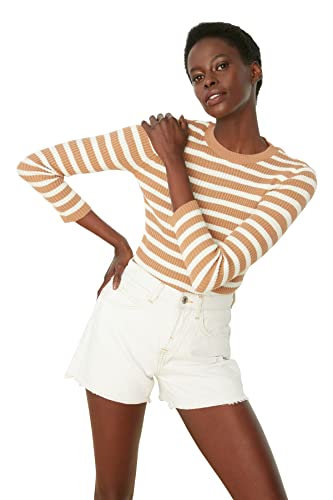 TRENDYOL Dam beige polotröja randig stickad kofta kofta tröja, Beige, L