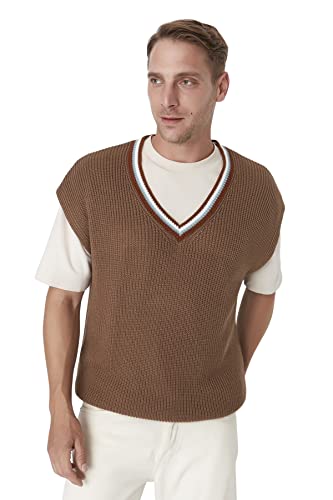Trendyol Herr man överdimensionerad standard v-ringad stickad tröja väst, Camel, XL