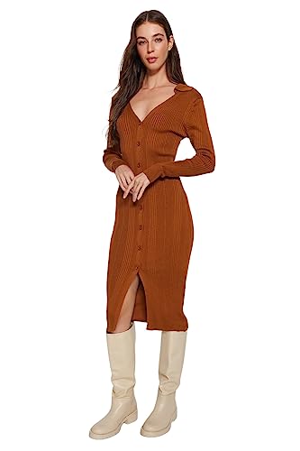 Trendyol Dam Kvinna Design Regular Jile V-ringad Stickat Klänning, Camel, M