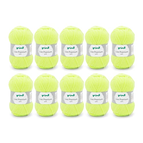 Gründl Lisa Premium Uni stick- och virkgarn (mjuk och ulliknande karaktär, lättvårdat stickgarn tillverkat av 100% polyakryl, 50 g/133 m, nåltjocklek: 3,5 – 4,5, 10 nystan á 50 g), neongul