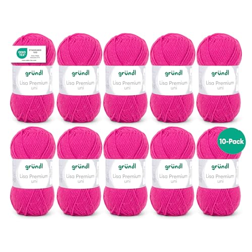 Gründl Lisa Premium Uni stick- och virkgarn (mjuk och ulliknande karaktär, lättvårdat tvättbart stickgarn tillverkat av 100% polyakryl, 50 g/133 m, nåltjocklek: 3,5–4,5, 10 nystan á 50 g), fuchsia