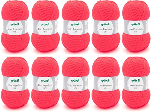 Gründl Lisa Premium Uni stick- och virkgarn (mjuk och ulliknande karaktär, lättvårdat stickgarn tillverkat av 100% polyakryl, 50 g/133 m, nåltjocklek: 3,5 – 4,5, 10 nystan á 50 g), neonkorall