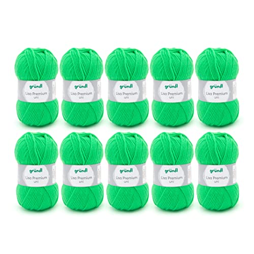 Gründl Lisa Premium Uni stick- och virkgarn (mjuk och ulliknande karaktär, lättvårdat stickgarn tillverkat av 100% polyakryl, 50 g/133 m, nåltjocklek: 3,5 – 4,5, 10 nystan á 50 g), neongrön