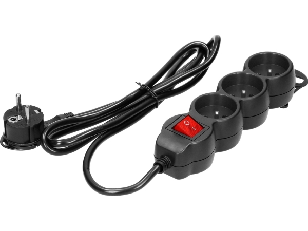 3Gang 2P+Z Förlängningskabel Med Brytare, 1,5M H05vv-F 3X1,5Mm2, Imax=16A, Flat Stickpropp, Svart
