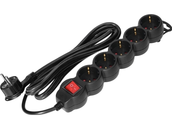 Orno 5-Vägs Förlängningssladd 2P+E (Schuko), Med Strömbrytare, 5M H05vv-F 3X1,5Mm2, Imax=16A, Flat Stickpropp, Svart