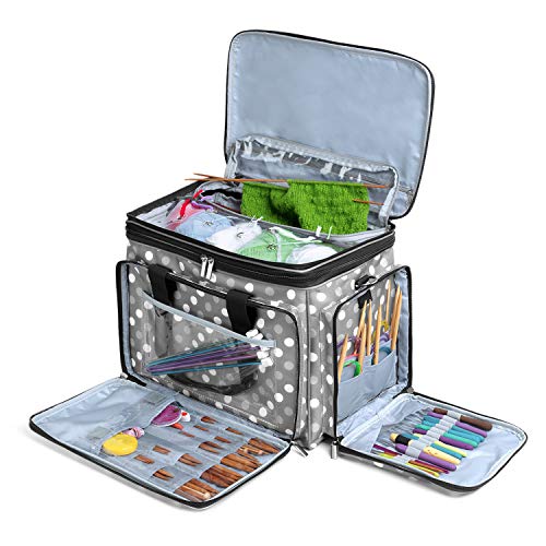 Luxja Stickväska, garnväska med lock, garnförvaring, organisatör för att bära projekt, sticknålar (upp till 35 cm), virknålar och andra tillbehör, (endast väska) grå prickar