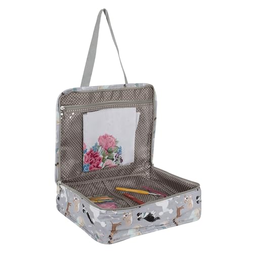 Hobby Gift Exklusivt projektfodral – sömnads- och garnförvaring, pyssel- och stickväska för klasser och resor, 3 plastfickor för tillbehör och organisering – 100% bomull 34 x 28 x 12 cm - Gråa hundar