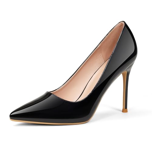 GENSHUO klassiska högklackade, spetsiga stilett mid-höga klackar för kvinnor, dam högklackade pumps 10 cm festklänning pumps skor lackläder, storlek 35-42 EU (svart, 36)
