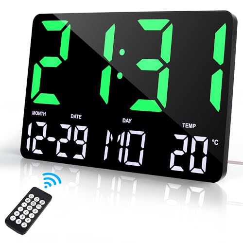 Lafocuse Digital väggklocka LED stor display 13 tum, digital klocka med fjärrkontroll, temperaturdisplay, datum, väckarklocka, ljusstyrka justerbar, 12/24 HR, lätt att läsa för vardagsrum kök kontor