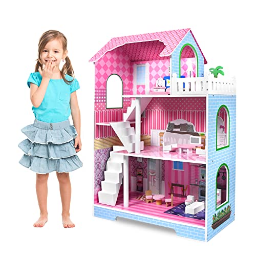TRMLBE Dockhus trä stor dockvilla 3 våningar med möbler och tillbehör gör-det-själv dockhus dockor leksak flicka lekset dockhus från 3 år – 70 x 36 x 100 cm