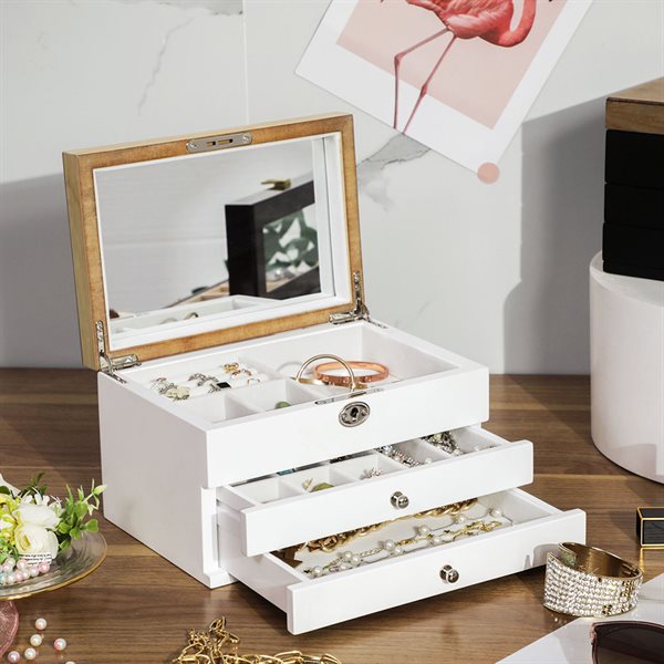 Smyckesskrin med 3 fack och stor spegel - Vit