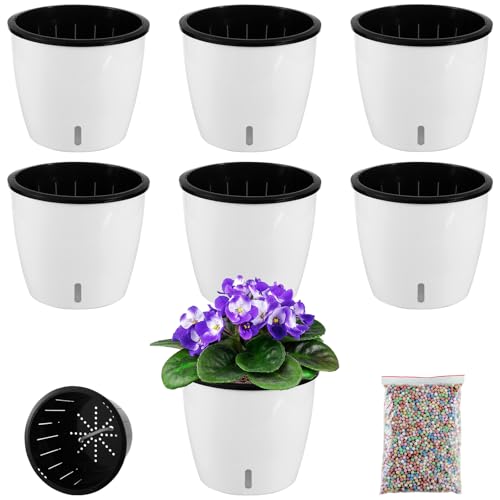 6-pack – 15 cm vita självvattnande växtkrukor för inomhusväxter med vattenindikator och svarta vekeror, stora afrikanska violetta krukor, självvattnande planterare för djävulens murgröna, orkidékrukor