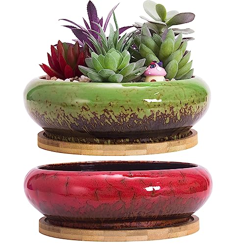 ARTKETTY Växtkrukor inomhus – 18,5/25 cm stora bonsaikrukor med brickor set med 2, färgglada suckulenta växtkrukor keramiska krukor för kaktusväxter trädgård dekorativ blomkruka