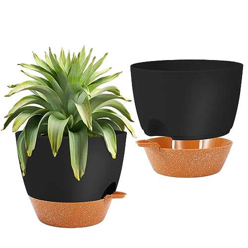 GARDIFE 25 cm växtkrukor, självvattnande krukor, 2-pack blomkrukor, stora plastplanterare med djup reservior och höga dräneringshål för inomhus utomhusväxter och blommor, svart