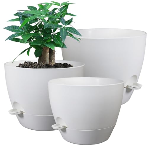 UOUZ Stora självbevattnande krukor, 30/25/23 cm, plastkrukor med högt placerade dräneringshål och djup reservoar, för inomhus- och utomhusväxter samt blommor, vit