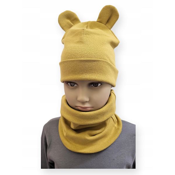 Set med hätta och halsduk för barn med öron storlek 52-56 Ocker