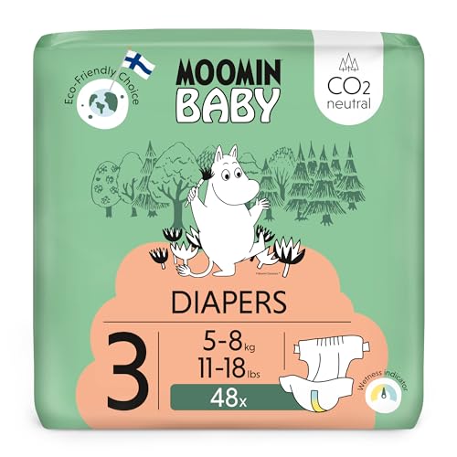 Moomin Baby Eco Newborn blöjor storlek 3, 5–8 kg, 48 premiumblöjor med fuktindikator | mjuka och hudvänliga, utan onödiga kemikalier |