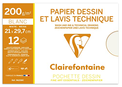 Clairefontaine - Ref 96258C - Tekniskt ritpapper (paket med 12 ark) - A4 (210 x 297 mm) i storlek, 200 gsm papper, lämpligt för lätta tvättar, kuvertpaket