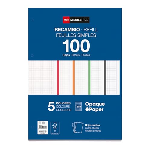 Miquelrius - Refill Pad limmade ark, 5 ränder av intensiva färger, 100 kvadratiska ark på 5 mm, A4-storlek, papper 90 g, med 4 hål