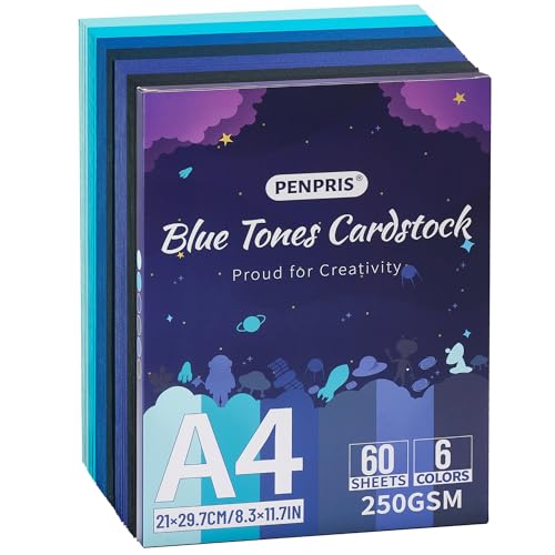 Blå toner kartong – 60 ark 6 färger A4 storlek 250 gsm/41 kg tungvikt kort lager papper för skrivare, korttillverkning, gör-det-själv-hantverk, scrapbooking PAC06MX2