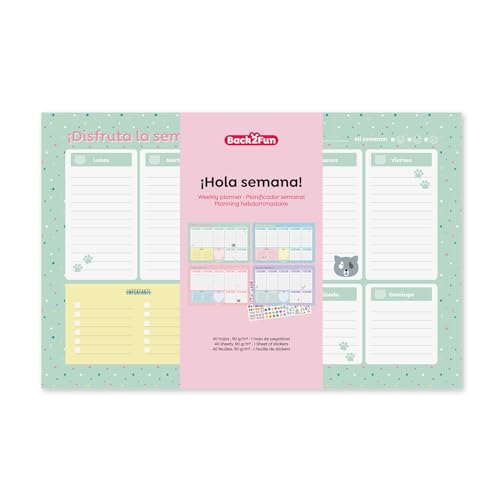 Miquelrius - Horisontell veckoplanerare Back2Fun, storlek 340 x 220 mm, tidlös A4 plus, limning, 40 ark, 4 sidlayouter, 1 sida klistermärken, papper 90 g/m², spanska