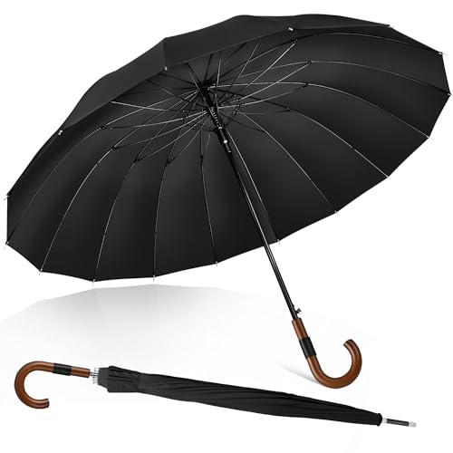 ZOMAKE Paraply trähandtag, stort paraply vindtätt starkt, klassiska promenadkäppparaplyer för män kvinnor, 16 ribbor, Svart-f, 16 Ribs