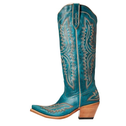Pasuot Western cowboystövlar för kvinnor – knähöga breda vadstövlar med klassisk broderad, dra på spetsig tå tjock klack mode retro klassisk dra på hög stövel för flickor, damer, höst vinter, Svart