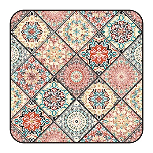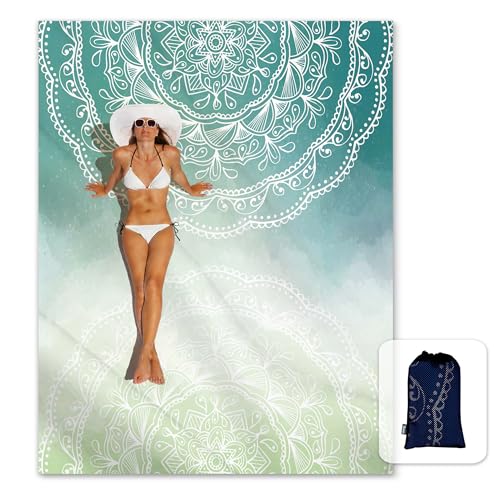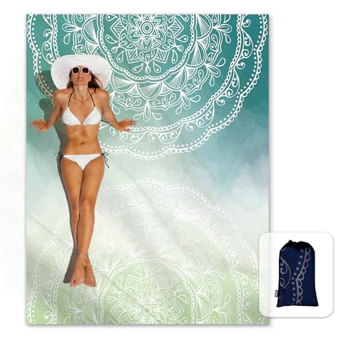 Solbelyst silkeslen mjuk boho sandsäker strandfilt sandsäker matta med hörnfickor och nätväska 15 x 18 cm för strandfest, resor, camping och utomhusmusikfestival, Tiffany grön mandala