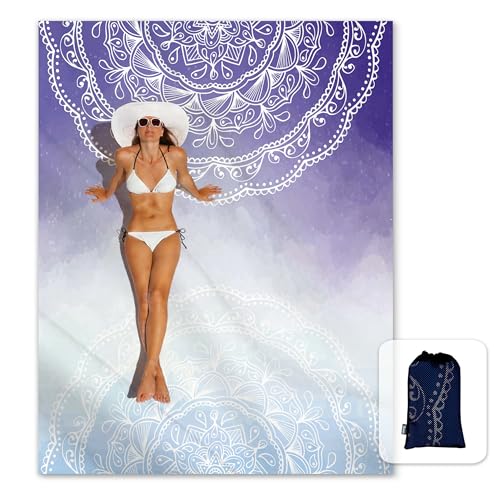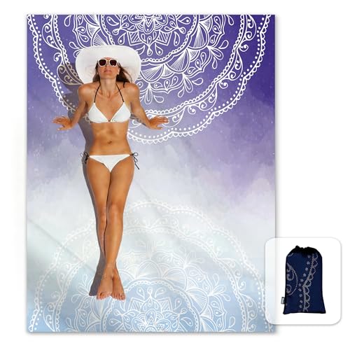 Solbelyst silkeslen mjuk 106 x 205 cm boho sandbeständig strandfilt sandbeständig matta med hörnfickor och nätväska för strandfest, resor, camping och utomhusmusikfestival, blå lila mandala