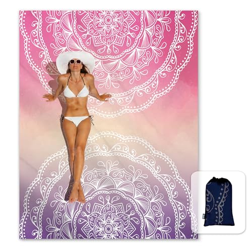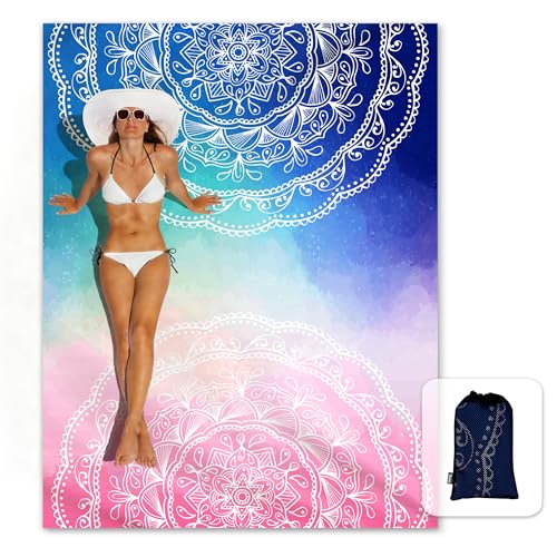 Solbelyst silkeslen mjuk strandfilt sandsäker matta med hörnfickor 213 x 185 cm nätväska, strandfest, resor, camping och musikfestival utomhus, mandala blå rosa
