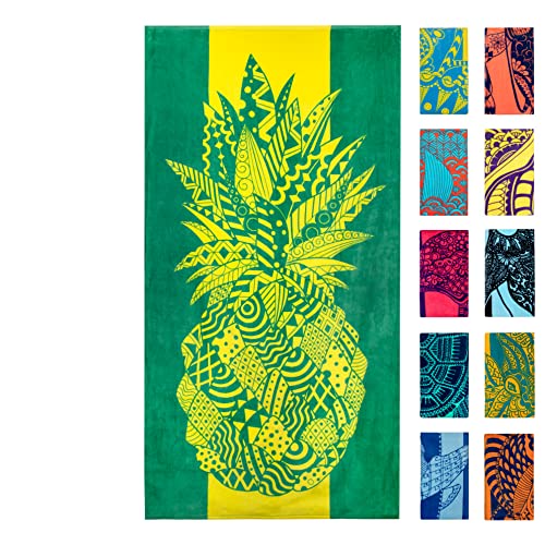 Nova Blue Ananas strandhandduk gul och grön med tropisk design, extra stor, XL (34 x 63 cm) tillverkad av 100% bomull för barn och vuxna