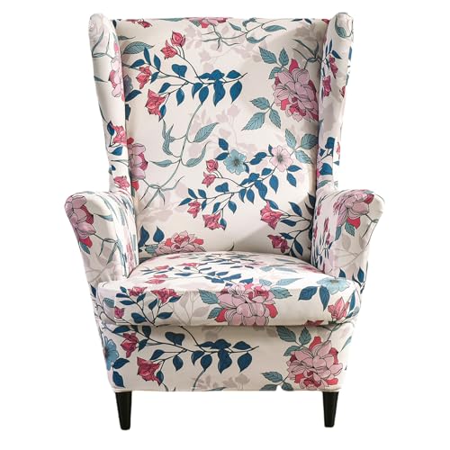 JUNLEBUYI Wingback stolsöverdrag 2-delat set, stretch spandex skydd med vingrygg och stolskydd, blommönster, strandmon fåtöljöverdrag för vardagsrum, sovrum, hotell (010)