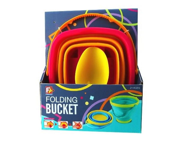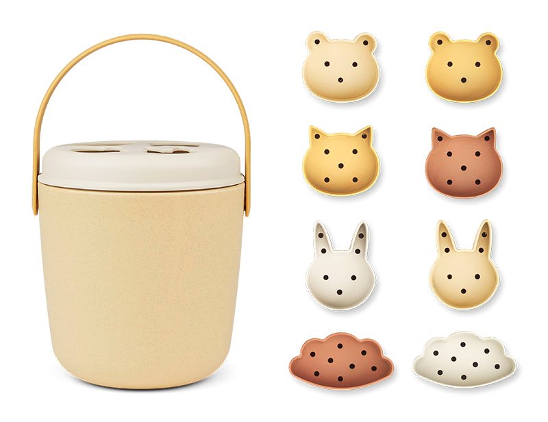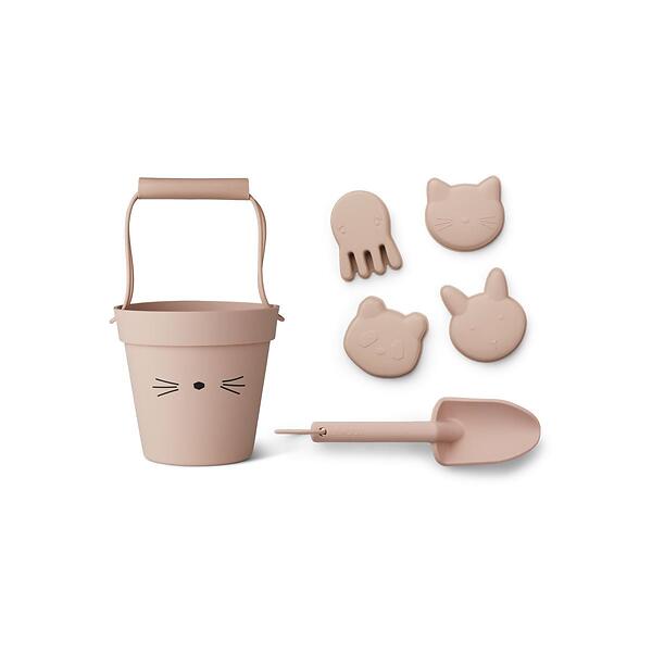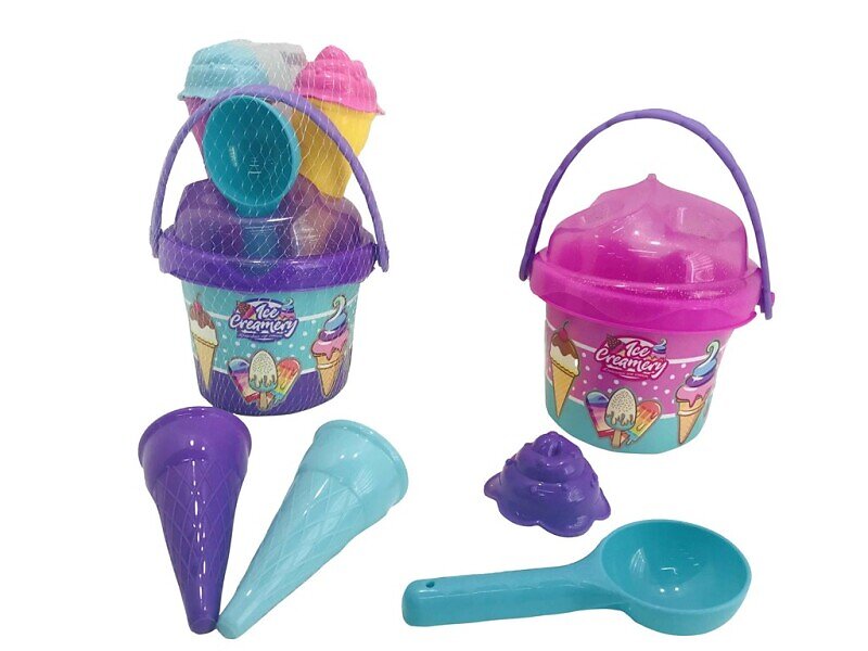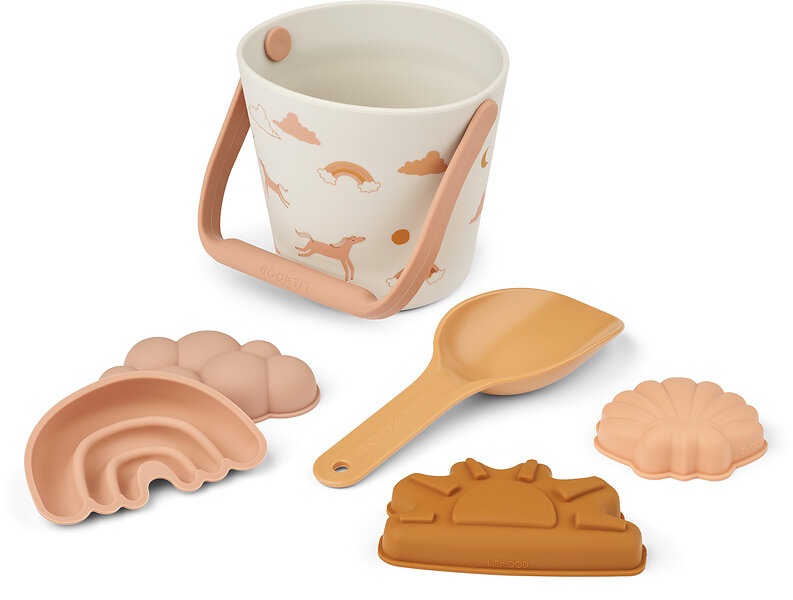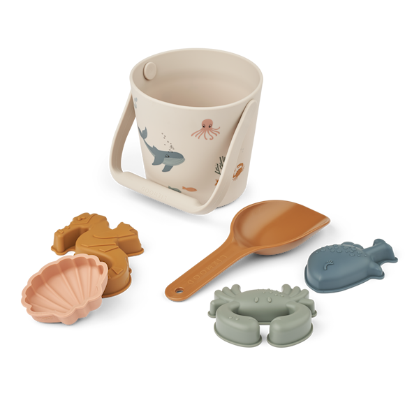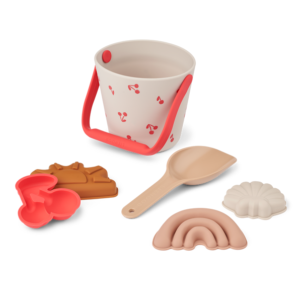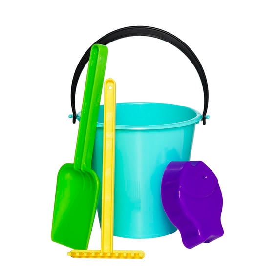 Strandset med hink (Ø18 cm), spade, kratta och en (1) slumpmässigt utvald sandform