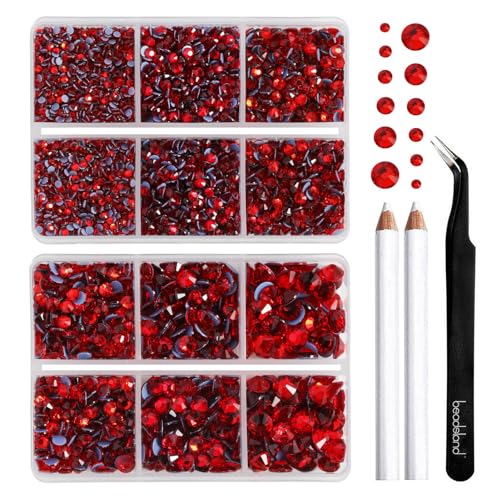 Beadsland SS6-SS30 Hotfix-strass, 6 080 st. ljusröda strasstenar för kläder och hantverk, kit med 6 blandade storlekar, vaxpenna och pincett, ljus siamröd