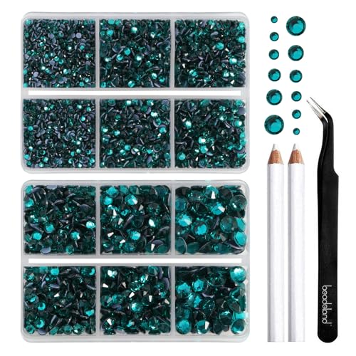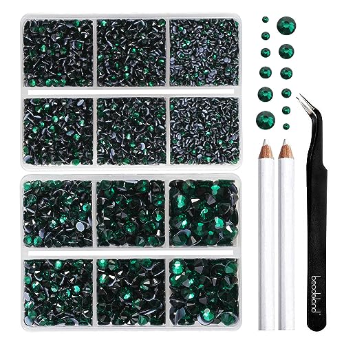 Beadsland SS6-SS30 Hotfix-strass, 6 080 st. gröna strasstenar för kläder och hantverk, kit med 6 blandade storlekar, vaxpenna och pincett, smaragd