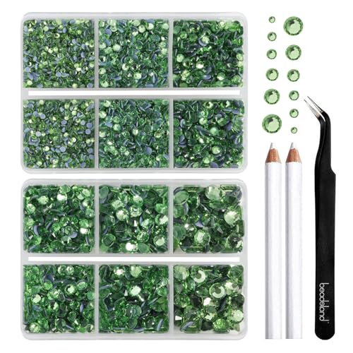 Beadsland SS6-SS30 Hotfix-strass, 6 080 st. ljusgröna strasstenar för kläder och hantverk, kit med 6 blandade storlekar, vaxpenna och pincett, peridot