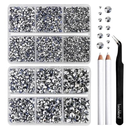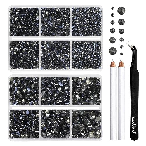 Beadsland SS6-SS30 Hotfix-strass, 6 080 st. gråa strasstenar för kläder och hantverk, kit med 6 blandade storlekar, vaxpenna och pincett, diamantsvart