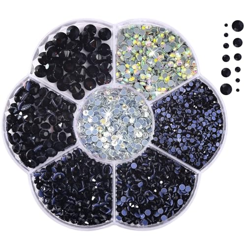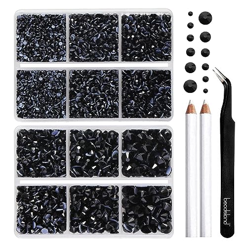 Beadsland SS6-SS30 Hotfix-strass, 6 080 st. svarta strasstenar för kläder och hantverk, kit med 6 blandade storlekar, vaxpenna och pincett, svart (Jet Black)