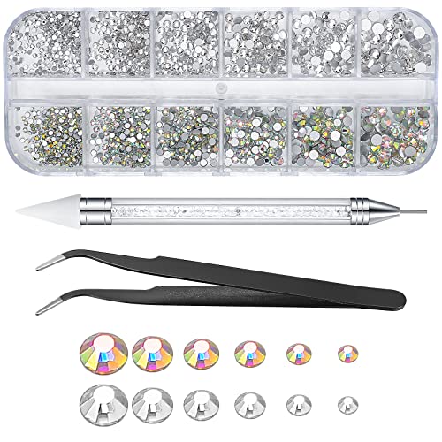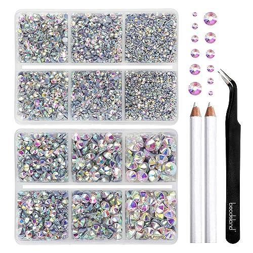 BEADSLAND Termosjälvhäftande strass, 4 000 st AB strass snabbkorrigering för kläder hantverk blandade 6 storlekar med vaxpenna och pincettkit, SS6-SS30, Crystal AB